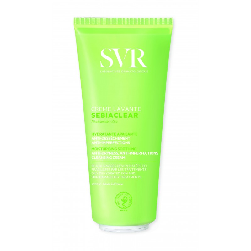 Η Sebiaclear Creme της SVR είναι κρέμα καθαρισμού προσώπου για δέρμα με ατέλειες και τάση ακμής. Πρόκειται για μία κρέμα καθαρισμού χωρίς σάπωνες με ενυδατική & καταπραϋντική δράση. Η Sebiaclear Creme Lavante της SVR είναι μια κρέμα καθαρισμού για το πρόσωπο και το σώμα, ιδανική για το αφυδατωμένο δέρμα με τάση ακμής και το ευαίσθητο δέρμα. Ακόμα και το ξηρό δέρμα μπορεί να βγάζει σπυράκια, και η μοναδική σύνθεσή της, με ψευδάργυρο και νιασιναμίδη, καθαρίζει απαλά το δέρμα ενώ καταπραυνει τον ερεθισμό και ενισχύει τον δερματικό φραγμό. Συσκευασία: σωληνάριο 200ml. Διατίθεται και σε μπουκάλι 400ml.