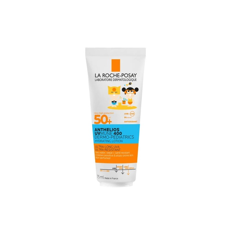 Το ενυδατικό αντηλιακό γαλάκτωμα La Roche Posay Anthelios SPF50+ Hydrating Milk 75 ml για παιδιά με πολύ υψηλή προστασία, σχεδιασμένο για την ευαίσθητη και εύθραυστη παιδική επιδερμίδα, καθώς και για δέρμα με τάση ατοπίας. Προσφέρει ευρέος φάσματος προστασία από την ακτινοβολία UVA και UVB, ενώ είναι κατάλληλο για χρήση τόσο σε πρόσωπο όσο και σε σώμα, καλύπτοντας τις καθημερινές ανάγκες προστασίας των παιδιών. Το αντηλιακό La Roche Posay Anthelios SPF50 Hydrating Milk παρέχει πολύ υψηλή φωτοπροστασία έναντι της UVB και UVA ακτινοβολίας, συμπεριλαμβανομένων των ultra-long UVA που σχετίζονται με βαθύτερες κυτταρικές βλάβες. Συμβάλλει στην πρόληψη ηλιακών εγκαυμάτων και στη διατήρηση της υγείας της παιδικής επιδερμίδας, ενώ παράλληλα ενισχύει την άμυνα απέναντι στο οξειδωτικό στρες.Η σύνθεσή του είναι εμπλουτισμένη με ενυδατικά και θρεπτικά στοιχεία που βοηθούν στην αποκατάσταση του υδρολιπιδικού φραγμού του δέρματος, προσφέροντας άνεση και προστασία ακόμη και σε ευαίσθητες ή αντιδραστικές επιδερμίδες.Είναι ιδιαίτερα ανθεκτικό στο νερό, στον ιδρώτα και στην άμμο, καθιστώντας το ιδανικό για παιχνίδι και δραστηριότητες σε εξωτερικούς χώρους. Περιέχει προηγμένα φωτοσταθερά φίλτρα με τεχνολογία προστασίας από μακρές UVA ακτίνες, όπως το Mexoryl 400, που ενισχύει την άμυνα της επιδερμίδας απέναντι στην ηλιακή ακτινοβολία. Παράλληλα, η παρουσία βιταμίνης E προσφέρει αντιοξειδωτική δράση, ενώ το βούτυρο καριτέ συμβάλλει στην ενυδάτωση και στην ενίσχυση του δερματικού φραγμού. Η σύνθεση είναι χωρίς άρωμα και έχει σχεδιαστεί για υψηλή ανεκτικότητα. Είναι κατάλληλο για παιδιά με ευαίσθητο, αντιδραστικό ή ατοπικό δέρμα που χρειάζονται πολύ υψηλή προστασία σε συνθήκες έντονης ηλιοφάνειας. Ιδανικό για καθημερινή χρήση σε πρόσωπο και σώμα, καθώς και για δραστηριότητες σε παραλία ή εξωτερικούς χώρους. Συσκευασία: σωληνάριο 75 ml.